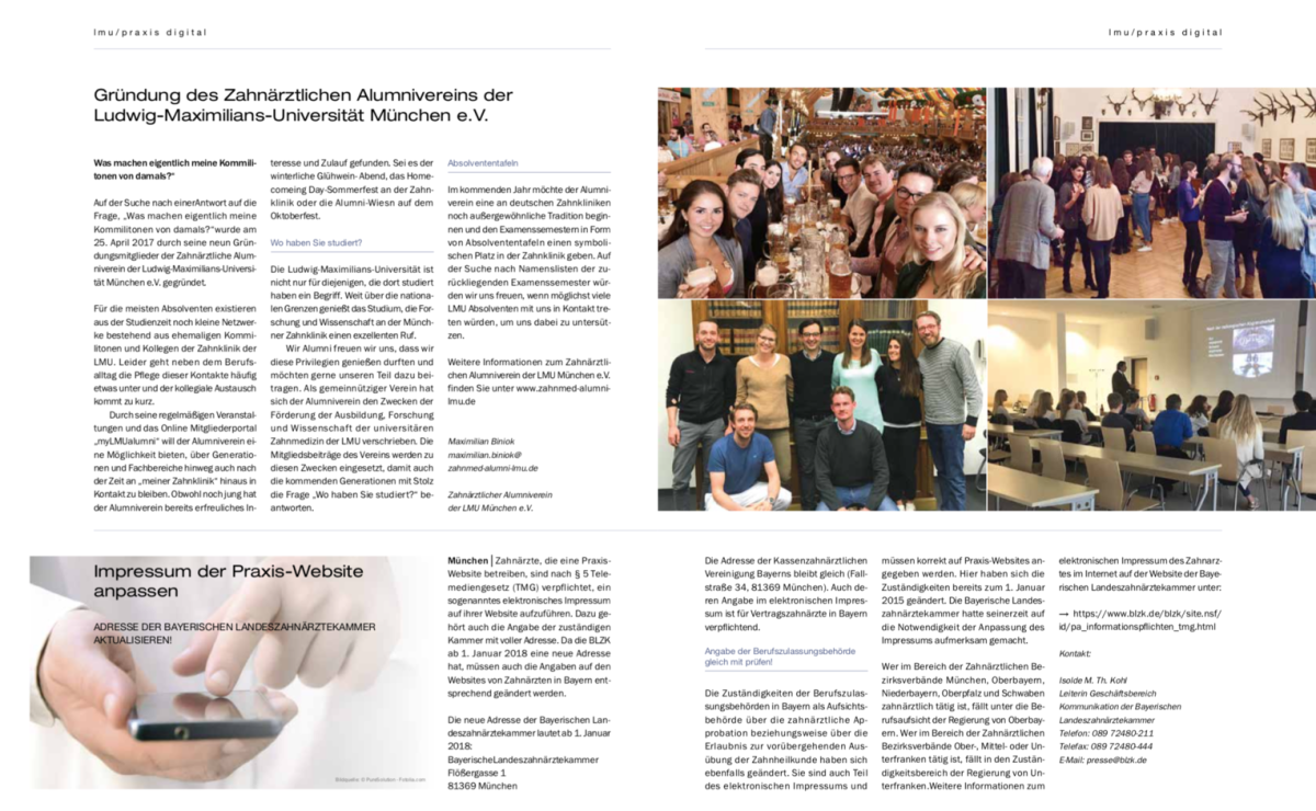 Am 25. April hat das Gründungstreffen des Zahnärztlichen Alumnivereins der Ludwig-Maximilians-Universität München stattgefunden. Die neun Gründungsmitglieder haben eine Vereinssatzung verabschiedet, die Gründung des Vereins beschlossen und den ersten Vorstand bestellt. Nun kann die Eintragung in das Vereinsregister vollzogen werden.